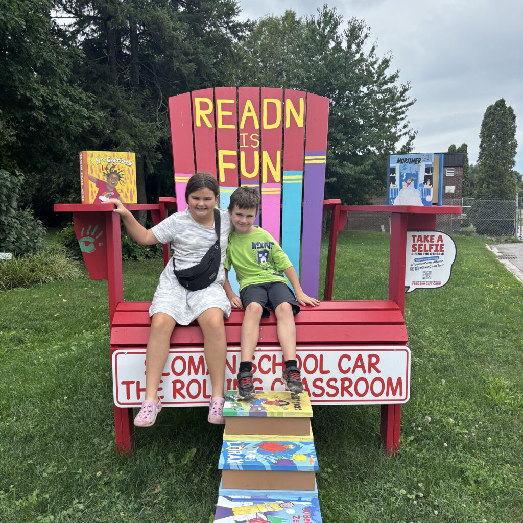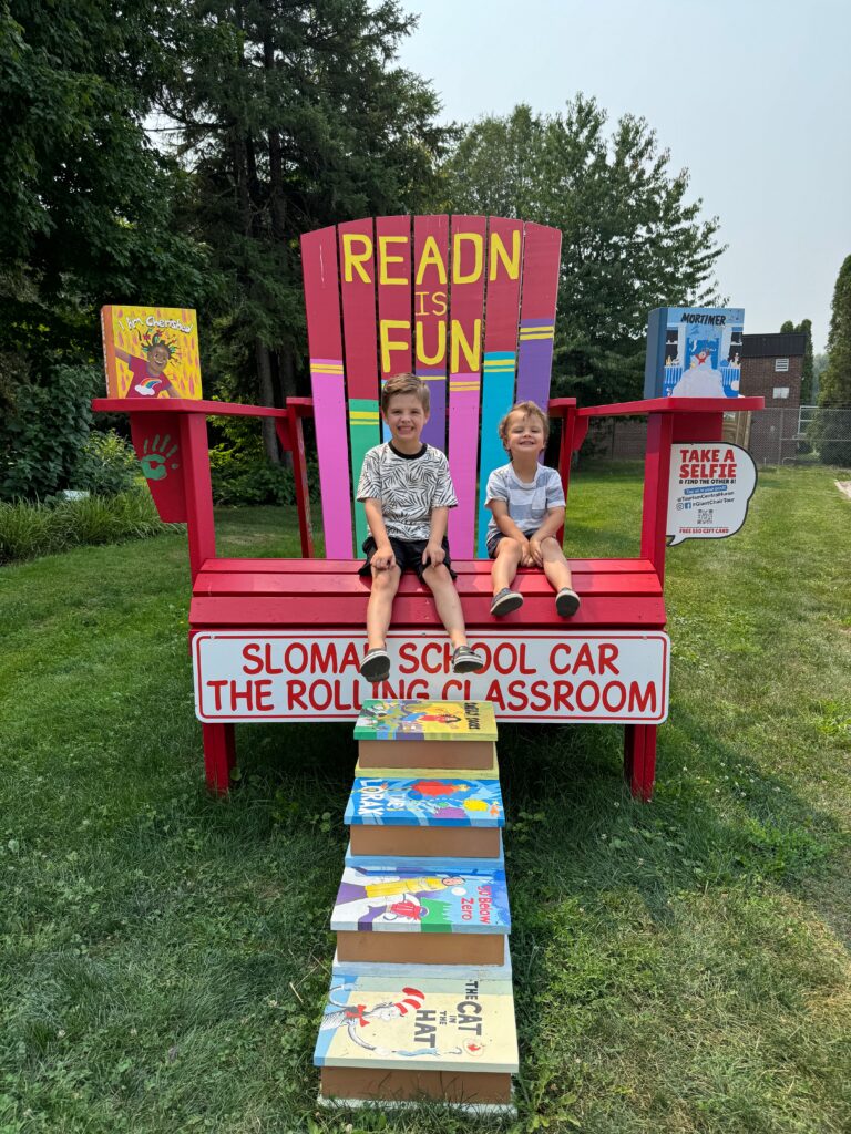 This chair sits beside the historic CNR Sloman School Car, a travelling classroom that once brought education to remote communities across Ontario. The location celebrates Canada’s railway heritage and the legacy of learning on the move. Students from St. Anne’s Secondary School painted the books on the chair featuring “The Cat in the Hat,” “50 Below Zero,” “The Lorax,” “Smelly Socks,” “I Am Cherished,” and “Mortimer.”